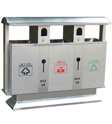 深圳新標準城中村街道社區(qū)不銹鋼五分類垃圾桶由有害垃圾、玻璃、金塑紙(為金屬、塑料、紙張的簡稱)、廚余垃圾、其他垃圾這5分類不銹鋼垃圾桶組合而成。其中金塑紙、其他垃圾日常產生量較大,所以分類收集容器也