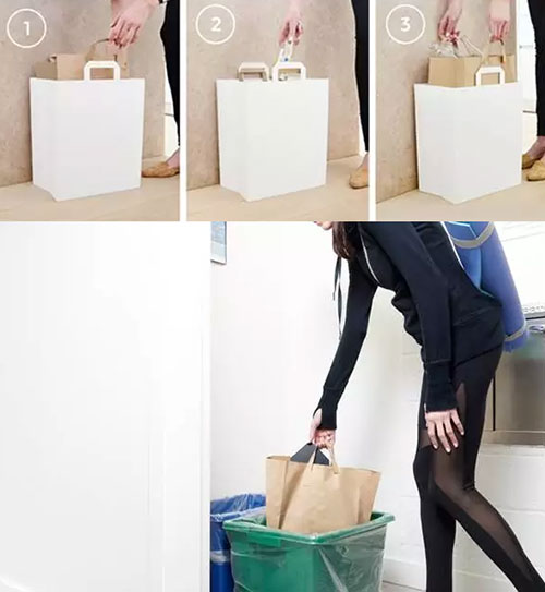 它的正確使用方式是搭配上購物紙袋,這一點(diǎn)和我們的習(xí)慣似乎不太一樣,也許是因為美國購物時使用紙袋更多,勤儉持家的家庭主婦們將這些紙袋用作垃圾袋,可是紙袋不夠牢固,放上東西便會東倒西歪,有這樣一個垃圾桶正好解決問題,其實(shí)它的外形也和購物紙袋有些相似呢。當(dāng)然,將紙袋換成我們習(xí)慣的塑料袋,照樣可以優(yōu)雅地裝垃圾。它有黑白兩色可選,放在辦公室、廚房均可。