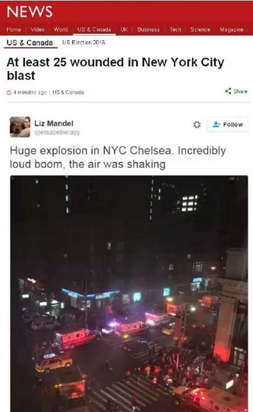 爆炸發(fā)生后,數(shù)百人已經(jīng)撤離現(xiàn)場,紐約警方已經(jīng)建議來往車輛和人群繞行該地區(qū),警方也對該區(qū)的其他垃圾箱進行檢查,以防仍有炸彈。