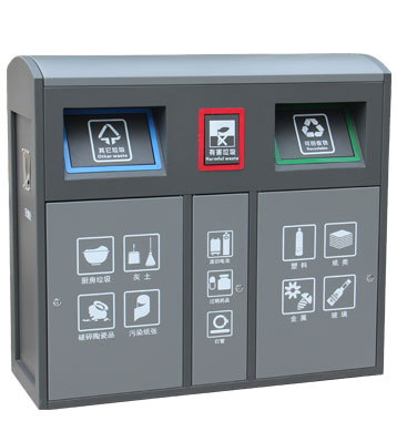 中山市政園林綠化工程定制的這款卡通風(fēng)格造型的戶外垃圾桶,紅、灰、藍(lán)三色分別用于有害垃圾、其他垃圾、可回收物垃圾分類收集使用,優(yōu)質(zhì)鍍鋅板金屬烤漆,帶宣傳欄平臺(tái)底座絲印“垃圾不落地,環(huán)境更美麗
