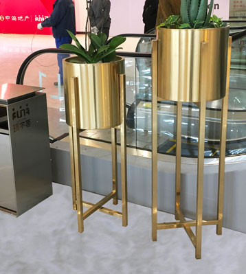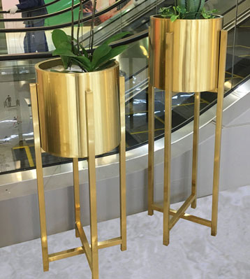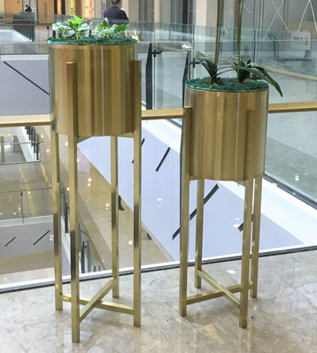 成都商場定制的高檔不銹鋼花盆采用304拉絲不銹鋼制作好后,整體再表面電鍍香檳金顏色效果,一高一矮組合擺放,整體高檔華麗!