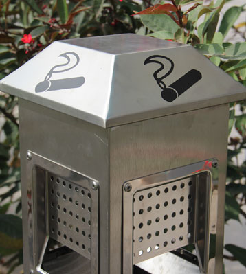 戶外公共場(chǎng)所不銹鋼滅煙柱方形設(shè)計(jì),大投口加面板鉚釘,面板有孔位便于未燃燒盡煙的空氣流通,預(yù)留小的煙蒂投口確保精準(zhǔn)投放。