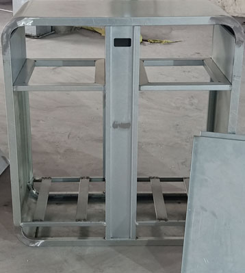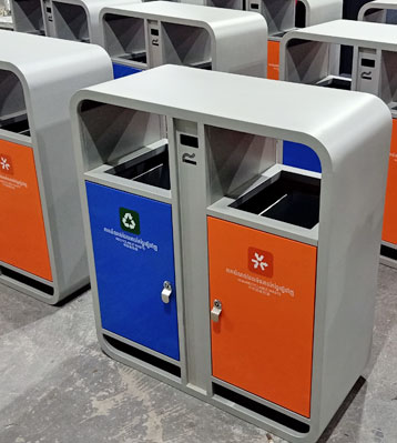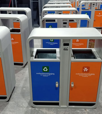 • 產(chǎn)品材質(zhì):城市環(huán)保垃圾桶采用優(yōu)質(zhì)冷軋鋼材料經(jīng)剪鈑下料、折彎、沖壓、焊接、打磨、等工藝:表面經(jīng)過(guò)除油、噴砂防銹處理后,再進(jìn)行酸洗磷化處理;表面清理干燥后整體進(jìn)行靜電噴涂或烤漆處理,靜電噴涂是經(jīng)過(guò)流水線高溫固化爐固化后再出爐冷卻,加工后的塑粉附著力強(qiáng),不易剝落;