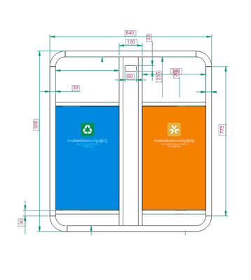 外筒鍍鋅板框架噴戶外淺灰色塑粉高溫烤漆,門板做藍(lán)色和橙色烤漆,分別對(duì)應(yīng)可回收物和其他垃圾并絲印分類標(biāo),內(nèi)筒與底座做隔層防潮,整體戶外擺放防銹耐用。