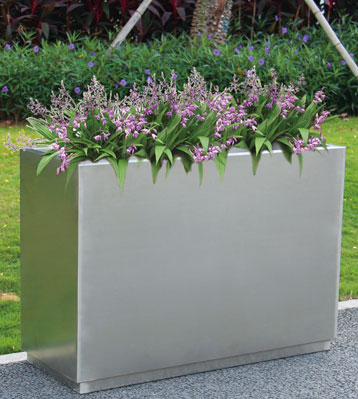 • 產(chǎn)品材質(zhì):不銹鋼長方形花箱可采用5mm加厚201#/202#/304#不銹鋼材料模壓或焊接成型,金屬亮澤,內(nèi)外表面光潔,易于清潔,表面可做電鍍壓紋、水鍍、蝕刻、納米鎳、無氰堿性光亮鍍銅工藝效果,無指紋處理高檔大氣;